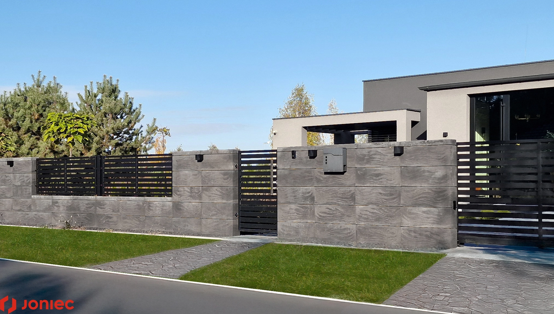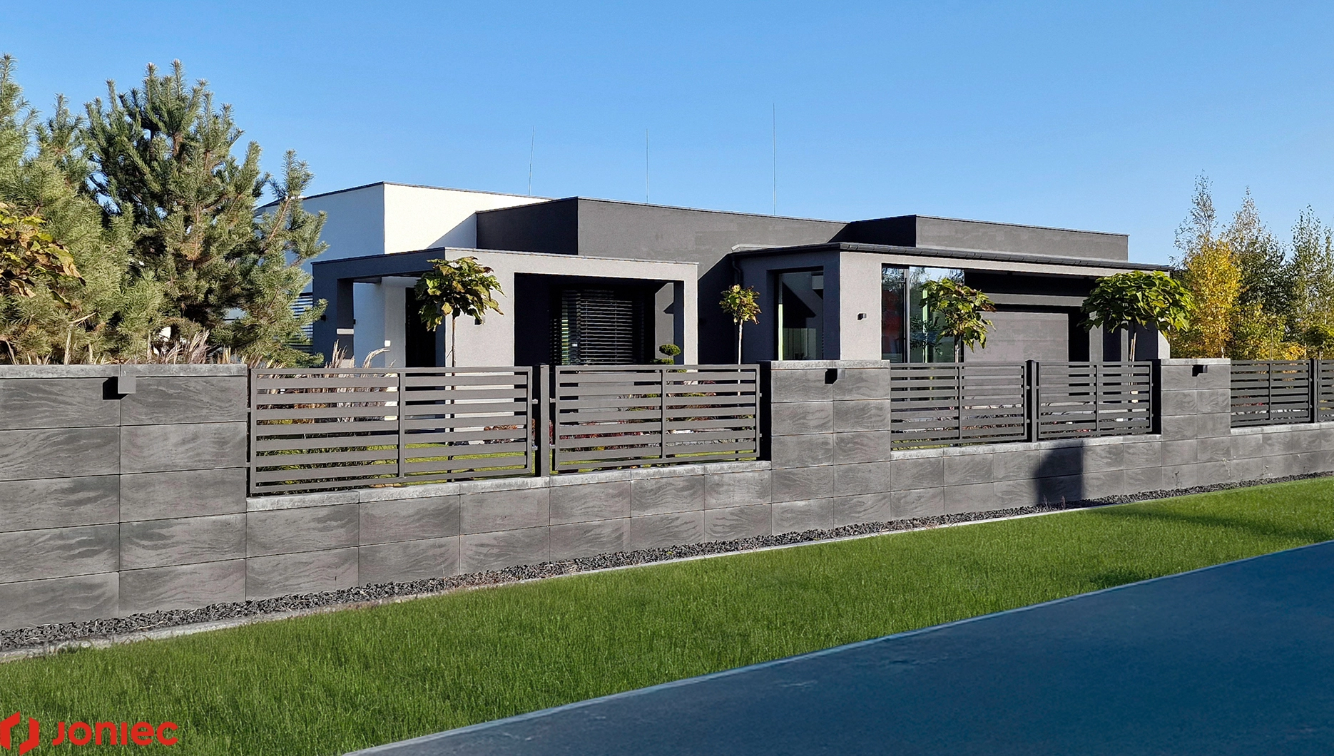 JONIEC® jako producent ogrodzeń betonowych w Małopolsce od lat dostarcza inwestorom sprawdzone systemy modułowe, w tym konstrukcje klasy premium. Masywne, wielkoformatowe bloczki systemu ROMA Mega lidyt tworzą solidną podstawę, którą w prezentowanym przykładzie uzupełniono metalowymi przęsłami o poziomym układzie lameli. Takie połączenie zapewnia prywatność i bezpieczeństwo mieszkańców, a jednocześnie prezentuje się świeżo i atrakcyjnie. Jeśli chcesz postawić na estetykę oraz jakość, nasze designerskie ogrodzenia betonowe w Małopolskiem, np. z bloczków ROMA Mega lidyt, będą idealnym wyborem. Znajdź swojego najbliższego dystrybutora JONIEC® i poznaj nasze rozwiązania.