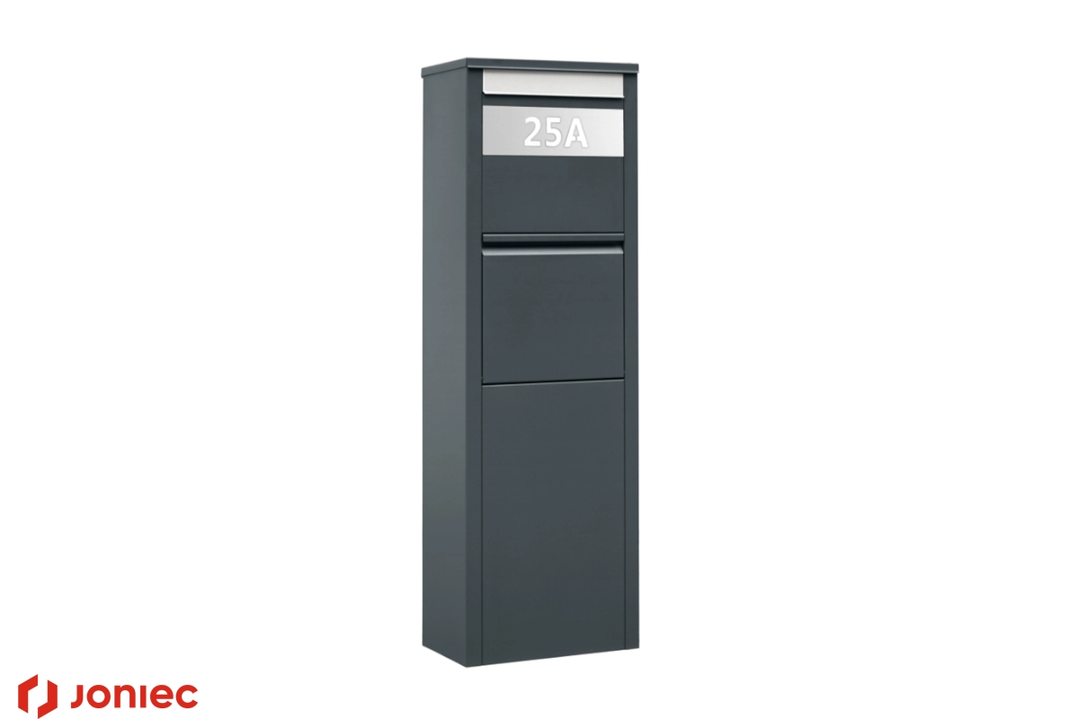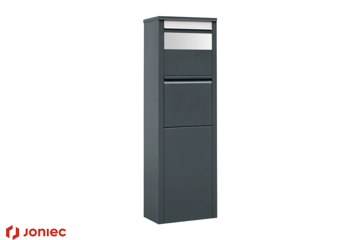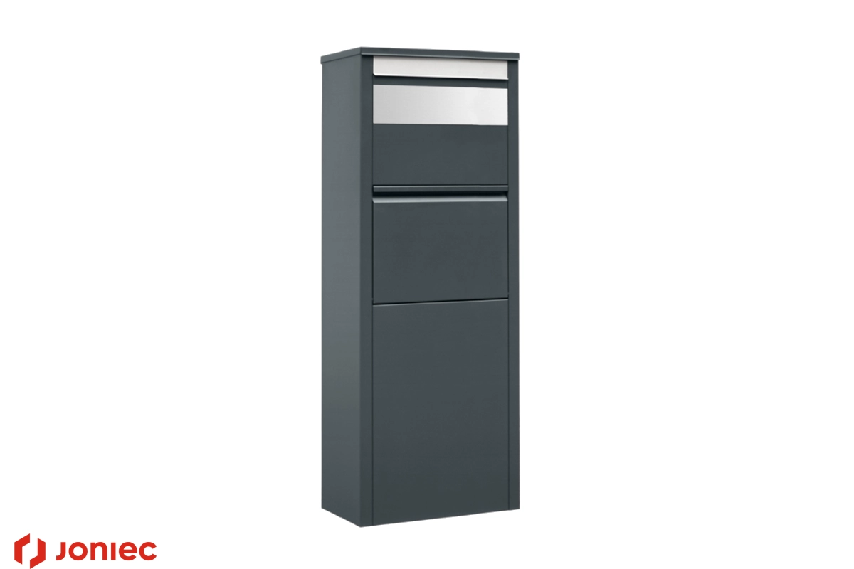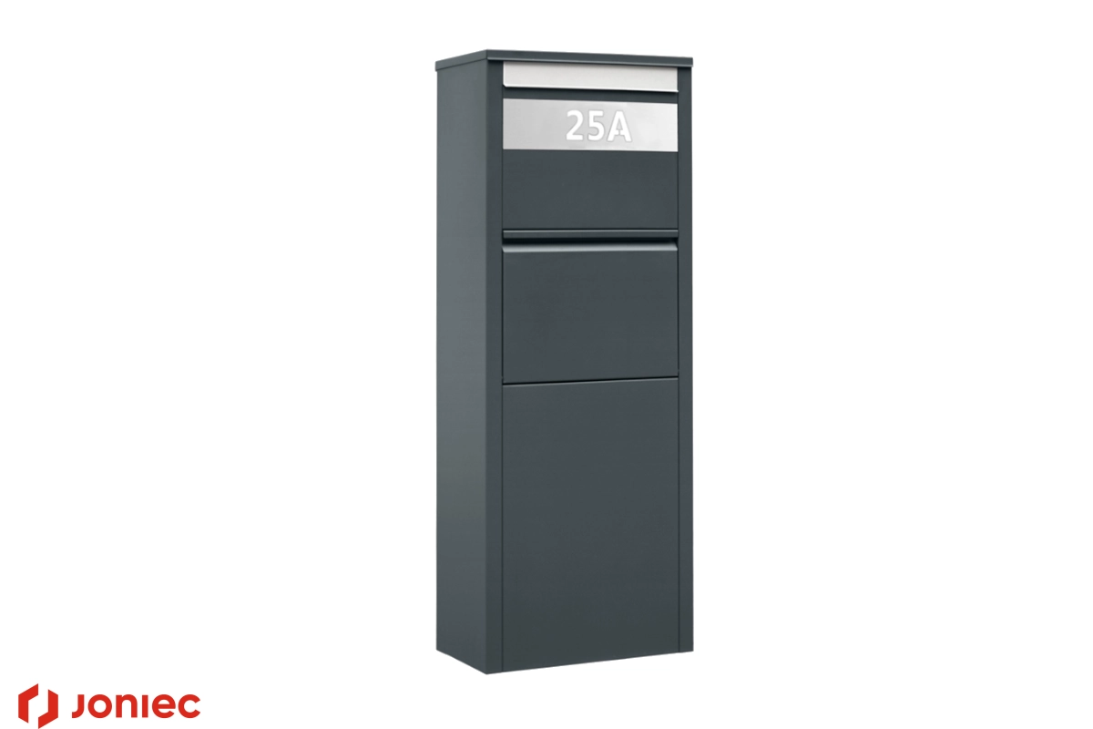 Górna część panelu frontowego posiada otwór wrzutowy na korespondencję zabezpieczony klapką z zagięciem ułatwiającym jej podniesienie. Poniżej znajduje się wrzutka na paczki z automatycznym systemem zapadkowym zabezpieczającym przesyłki przed kradzieżą.