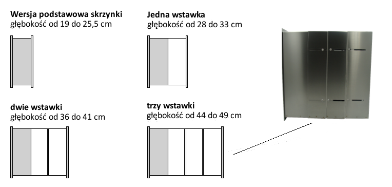 Głębokość skrzynki może zostać zwiększona poprzez zastosowanie uniwersalnych wstawek nierdzewnych pomiędzy dwoma częściami kieszeni (max do 3 sztuk).