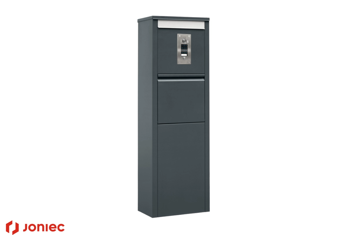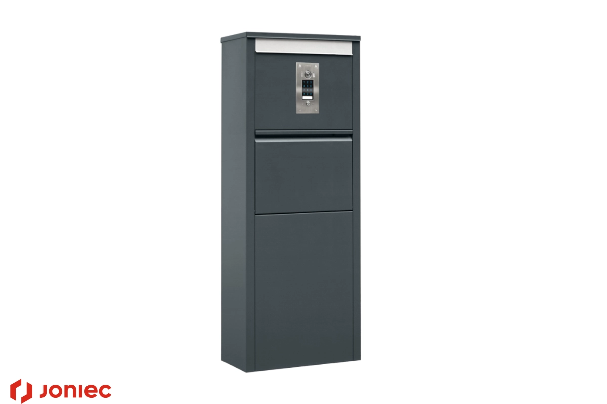 Górna część panelu frontowego posiada otwór wrzutowy na korespondencję zabezpieczony klapką z zagięciem ułatwiającym jej podniesienie. Poniżej znajduje się wrzutka na paczki z automatycznym systemem zapadkowym zabezpieczającym przesyłki przed kradzieżą.